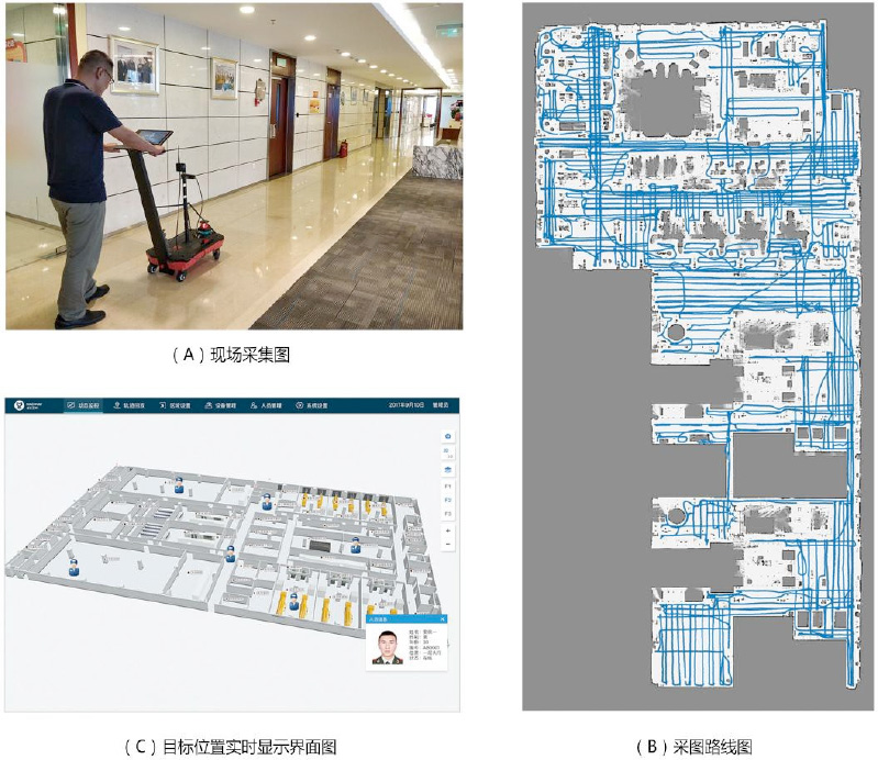 第一步,地磁图的采集。由人推着地磁图采集装置,或者带着采集终端,在应用场景内走一遍即可完成,一般只进行一次。